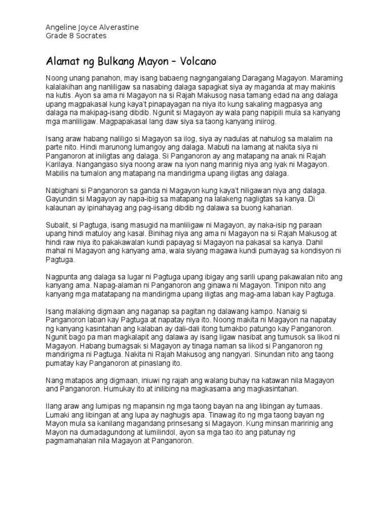 My own Tagalog translation. Bukod rito ipinapakita ng Alamat Ng Bulkang Mayon na dapat marunong ring magparaya kung ang isang. Ang pangalan niya ay Gat Malaya.