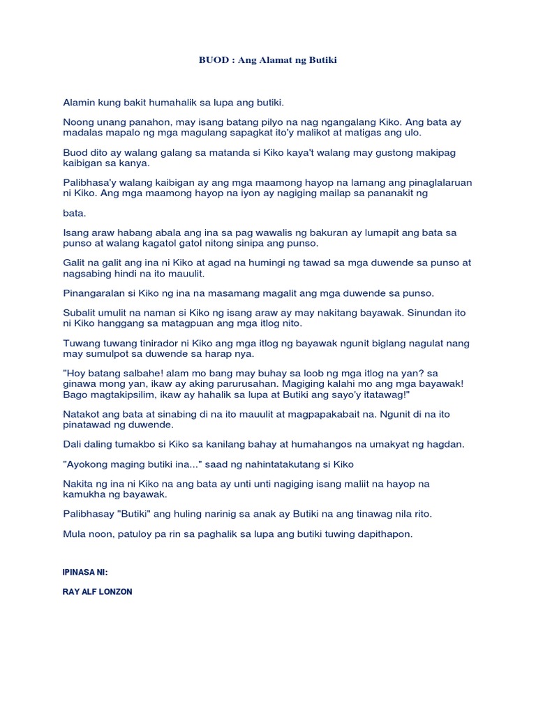 Ngunit tila lahat ng negatibong pag-uugali ay tinataglay na ni Pina. Once upon a time there was a mother and daughter who lived in a remote area. Noong unang panahon may isang batang pilyo na nag ngangalang Kiko.