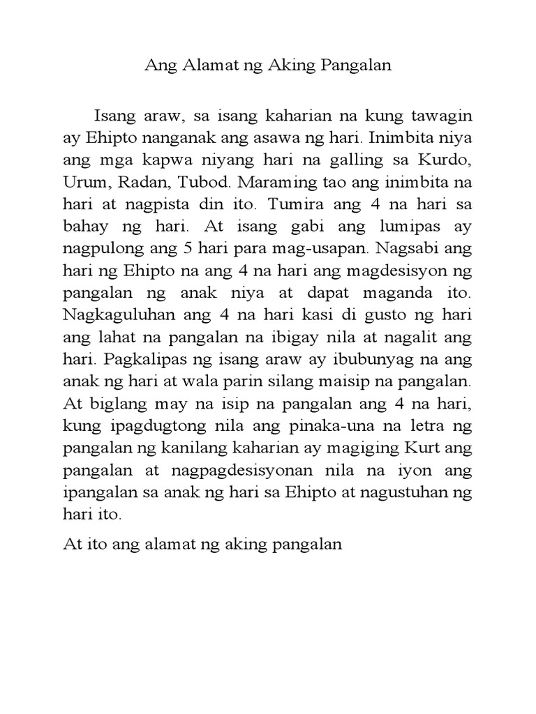 11 Ikaw ay karapat-dapat Panginoon at aming Diyos na tumanggap ng kaluwalhatian at karangalan at. Pangalawa tiyakin na ang alamat na isusulat nyo ay hindi pa. Noong araw sa bayan ng Sariwa naninirahan ang lahat ng uri ng gulay na may kanya-kanyang kagandahang taglay.