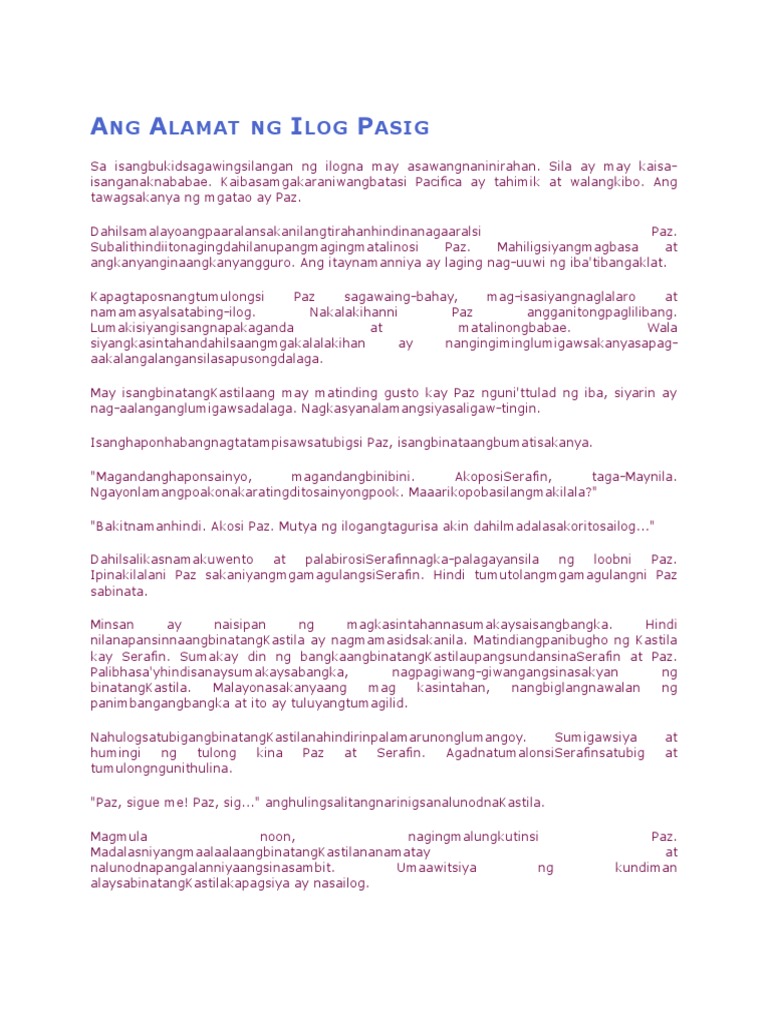 Alamat ng ilog pasig. Alamat ng Ilog Pasig a. Nagustuhan ko ang isang kwento sa Alamat ng Ilog Pasig na patungkol sa isang magkasintahan. Dahil malayo sa paaralan ang kanilang lugar ay hindi na nakapag-aralsi Paz.