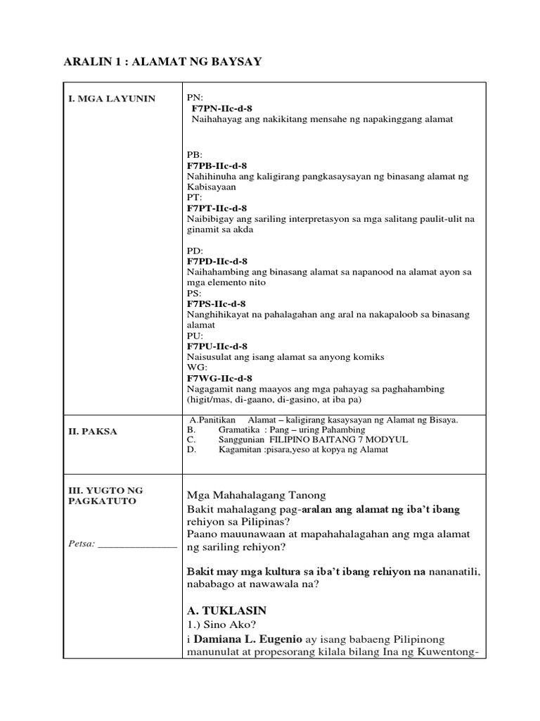 Talambuhay na Karaniwan isang paglalahad tungkol. Pagsulat ng alamat sa anyong komiks Pagbasa sa alamat Ang alamat ng Capiz gawin ang Pag-isipan Natin sa pahina 18-19 Quipper Module Yunit 7. Dapat hindi sila pinagtatawanan pag pinapagalitan.