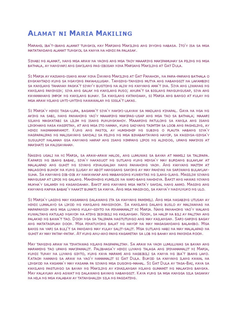 Isa siyang halimbawa ng mga kilalang diwata sa Pilipinas katulad ni Maria Makiling ng Los Baños at Maria Cacao ng. Contextual translation of buod ng alamat ng maria makiling into English. Kahit isa siyang makapangyarihang diwata ay nakikihalubilo pa rin siya sa mga mortal.