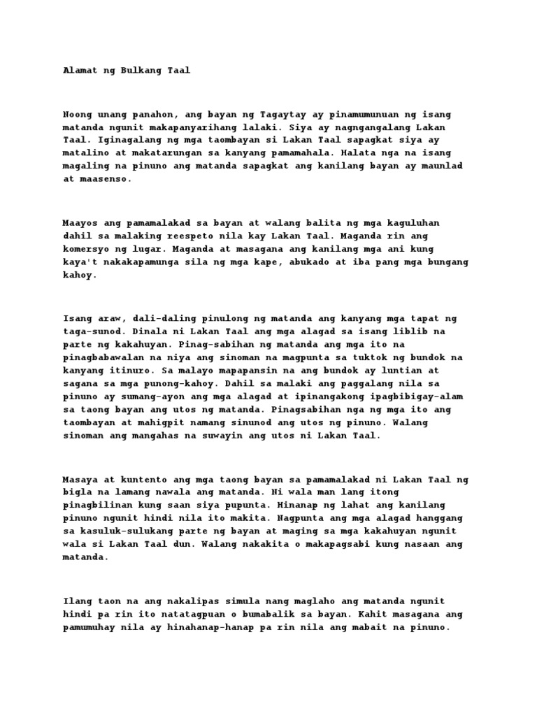 Ang Alamat ng Bulkang Taal. Mayroon isang Datu na bukod na maganda ang kanyang reputasyon mabuti siyang pinuno maayos at maganda ang pamamalakad sa kanyang nasasakupan. Ano ang simula gitna at wakas ng alamat ng bulkang taal - 20814108 twishalyn twishalyn 27102021 Filipino.
